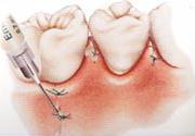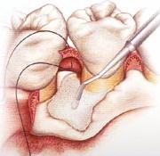 メンブレンを装着させる前に歯肉内を洗浄し、病原菌に侵された骨の表面も取リ除き患部を隅々まで清潔にします。